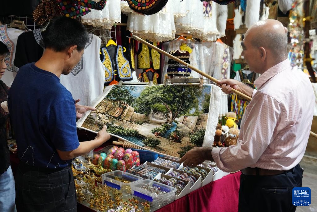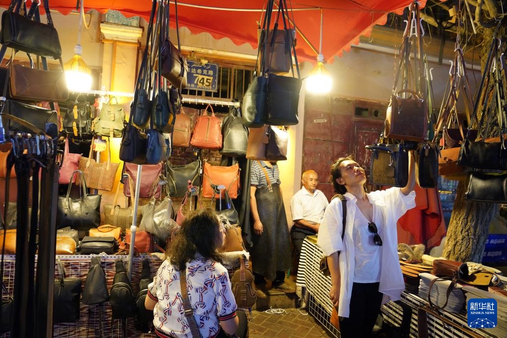 9月19日晚,在新疆喀什古城景区,游客在选购皮包。