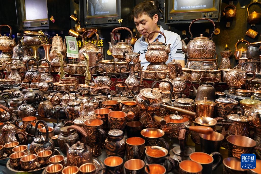 新疆喀什古城内琳琅满目的铜器商品(9月19日摄)。