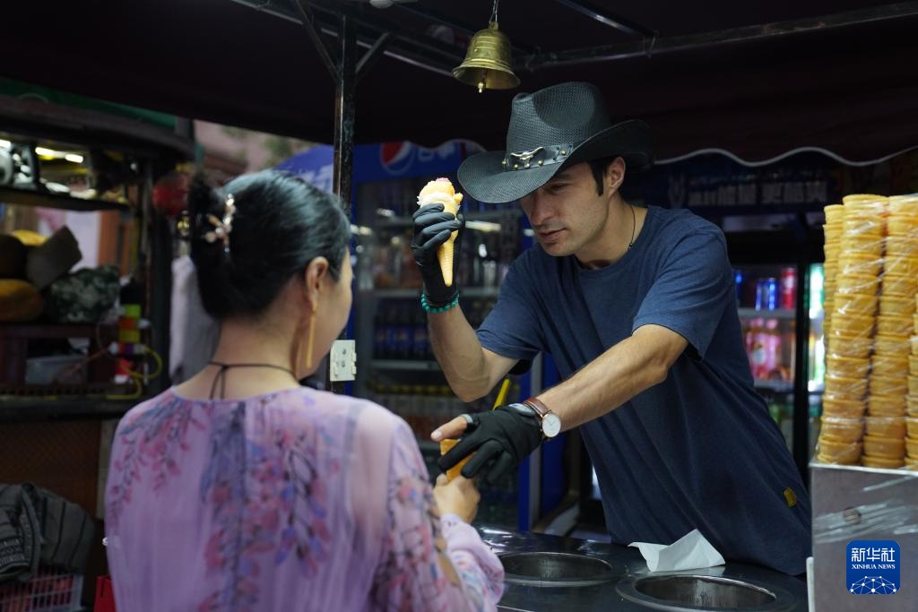 9月19日晚,在新疆喀什古城景区,一名网红冰激凌店店主用变戏法的方式为游客呈上冰激凌。