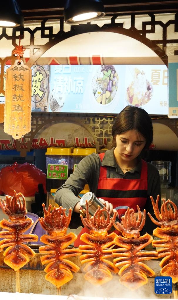 9月19日晚,在新疆喀什古城景区,一名维吾尔族姑娘在制作小吃。