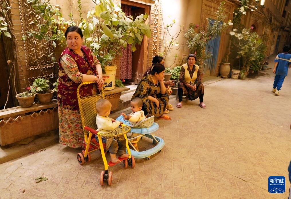 9月19日晚,居民在新疆喀什古城景区纳凉、休闲。喀什古城既是景区,也是居住区。
