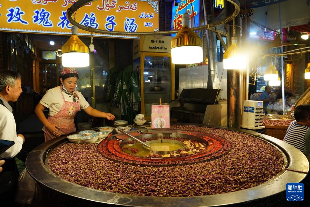 9月19日晚,在新疆喀什古城景区,一名游客购买特色小吃“玫瑰花鸽子汤”。