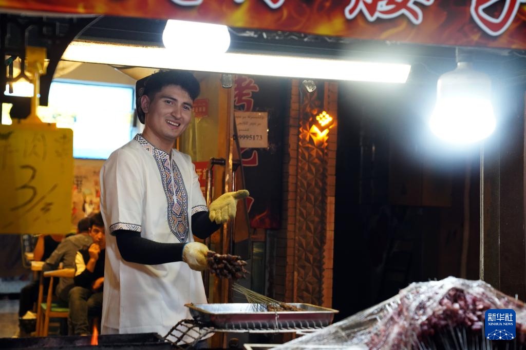 9月19日晚,在新疆喀什古城景区,一名维吾尔族小伙在售卖羊肉串。