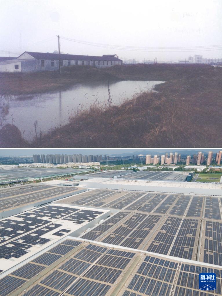 这是一张拼版照片:上图为创业初期的奇瑞厂房外景(奇瑞供图);下图为9月12日拍摄的位于安徽省芜湖市的奇瑞智造一工厂外景(无人机照片,新华社记者黄博涵摄)。