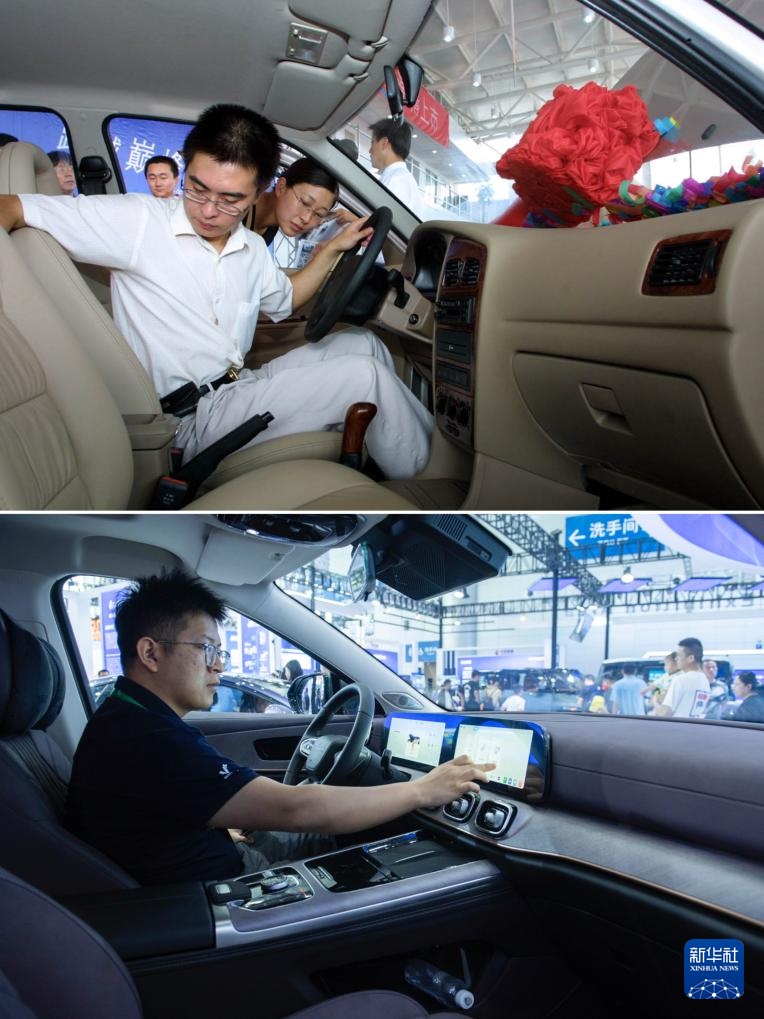 这是一张拼版照片:上图为2003年8月18日,奇瑞推出的2003年第三款新车——“奇瑞·旗云”在北京揭开面纱,一位参观者在车内观摩(新华社记者 于小平 摄);下图为9月21日,观众在2024世界制造业大会展馆内参观体验一辆奇瑞风云T10参展车(新华社记者 傅天 摄)。