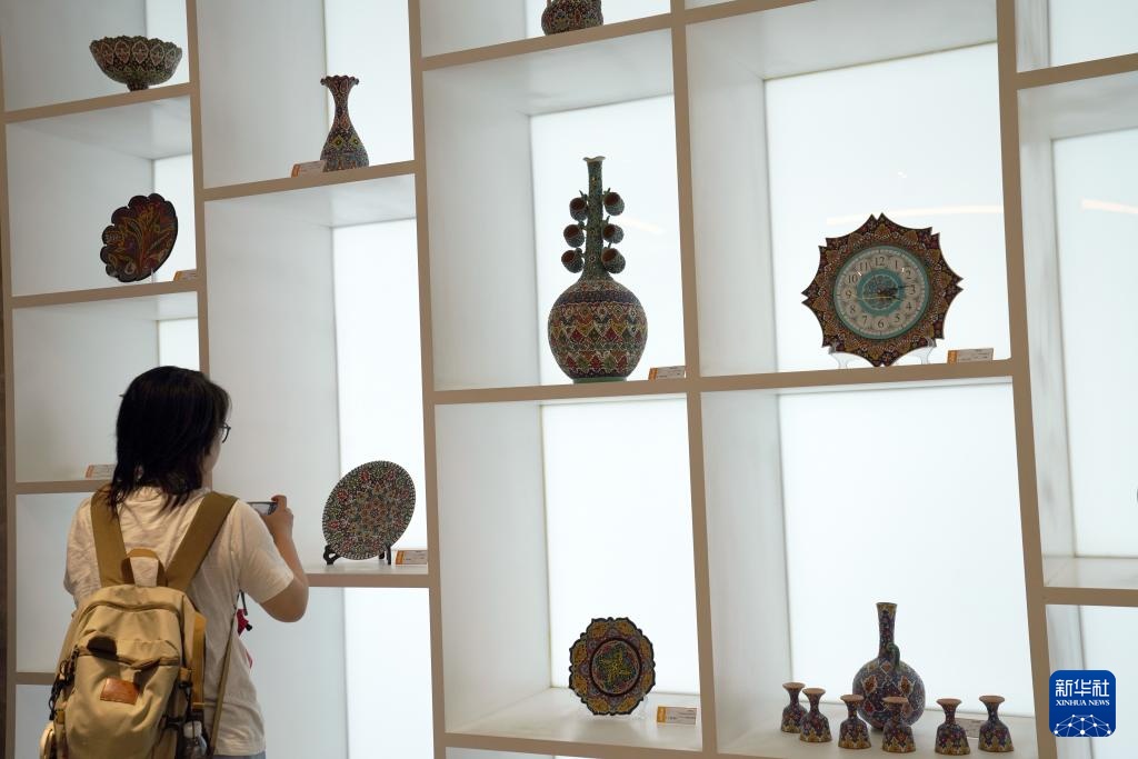 9月19日,在新疆喀什跨境电商进出口商品展示交易中心,顾客拍摄展出的各国工艺品。