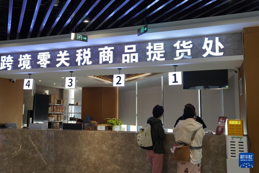 9月19日,在新疆喀什跨境电商进出口商品展示交易中心,顾客在跨境零关税商品提货处咨询。