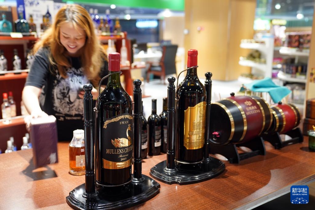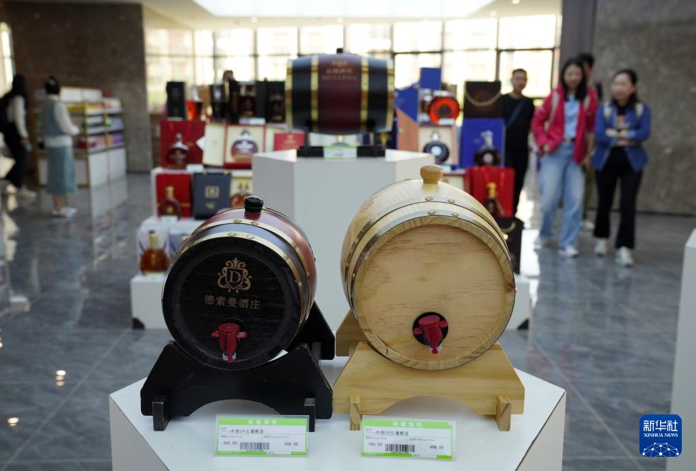 9月19日,在新疆喀什跨境电商进出口商品展示交易中心,顾客在红葡萄酒展区参观。