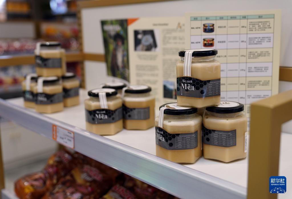 这是新疆喀什跨境电商进出口商品展示交易中心内售卖的吉尔吉斯斯坦蜂蜜(9月19日摄)。