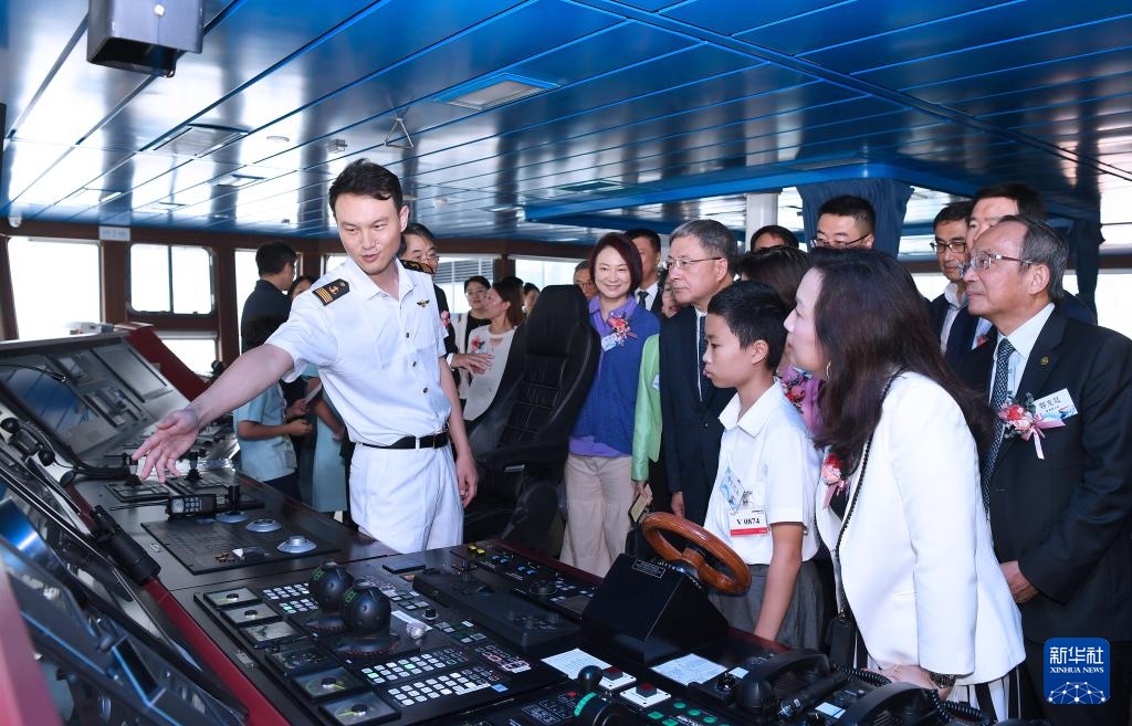9月24日,香港小学生代表在“深海一号”远洋科考船上参观地质实验室。