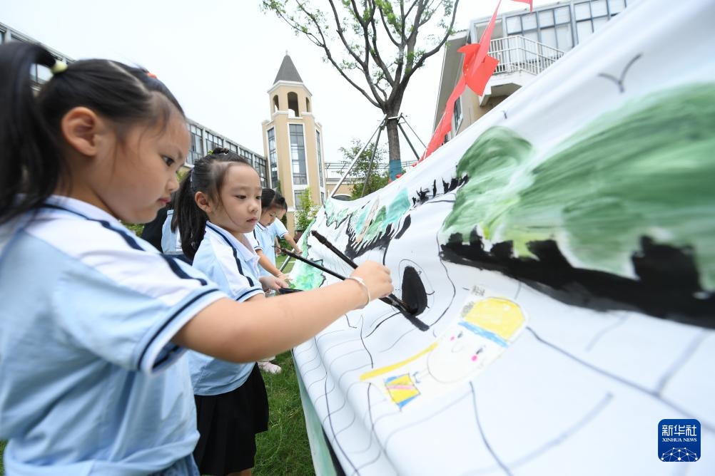 9月24日,湖州吴兴区八里店镇中心幼儿园的孩子们在长卷上描绘长城。