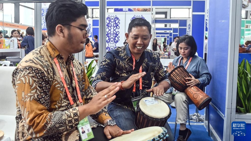 9月24日,在南宁国际会展中心柬埔寨馆,参展商敲打手鼓吸引观众。