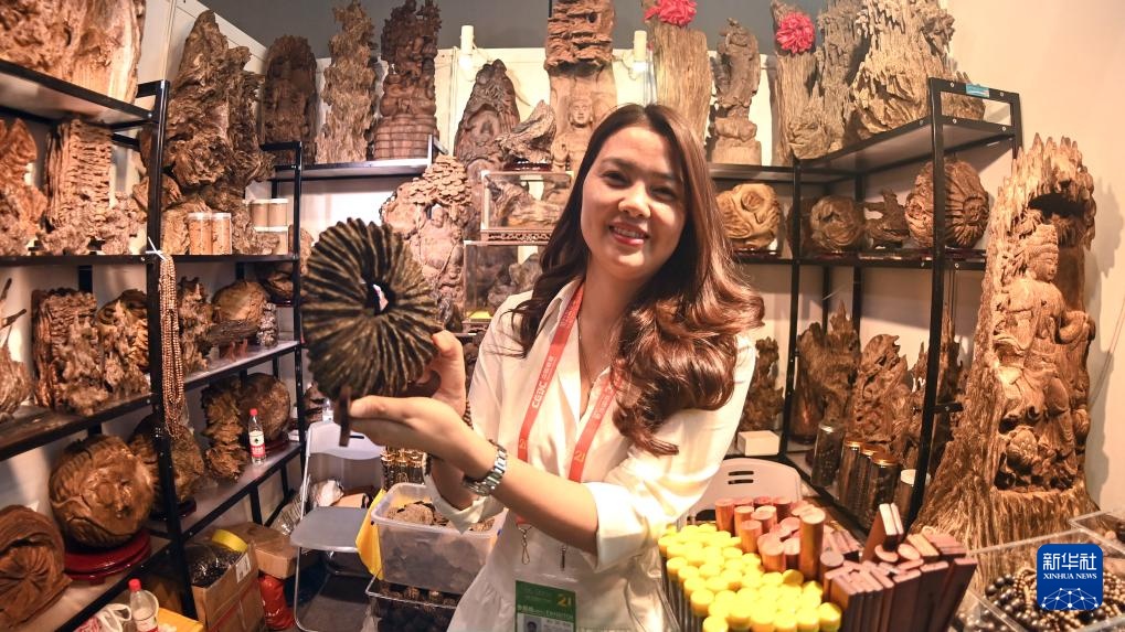 9月24日,在南宁国际会展中心越南馆,一名参展商在推销沉香木。