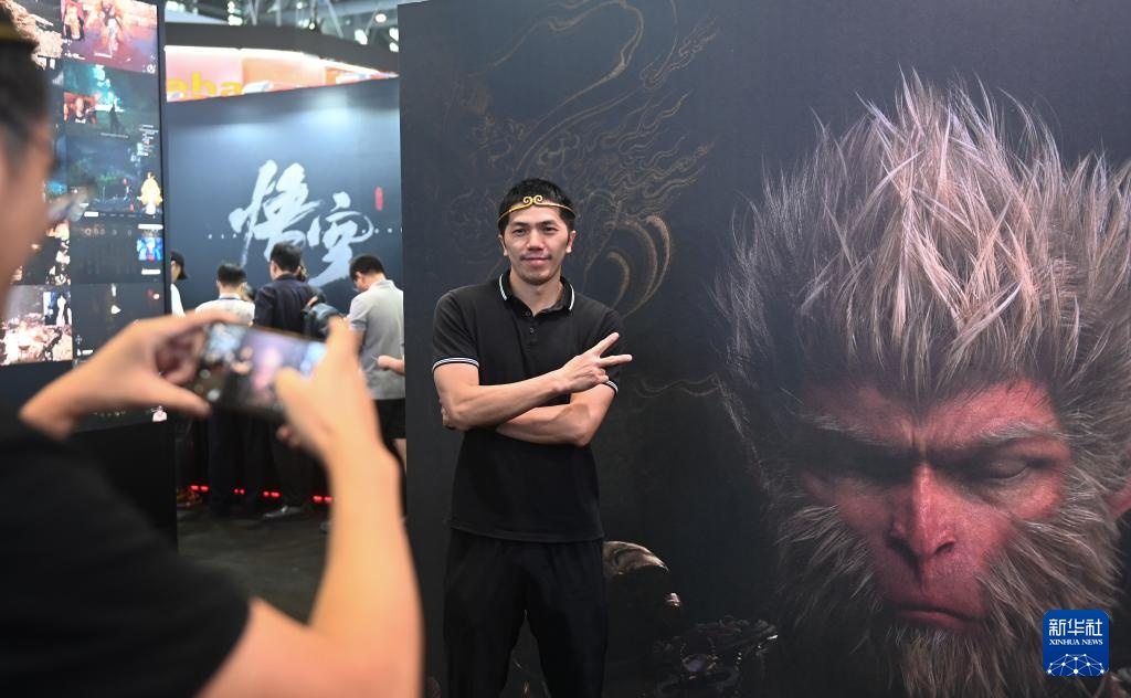 9月25日,观众在国内首款3A游戏“黑神话·悟空”展区打卡留念。