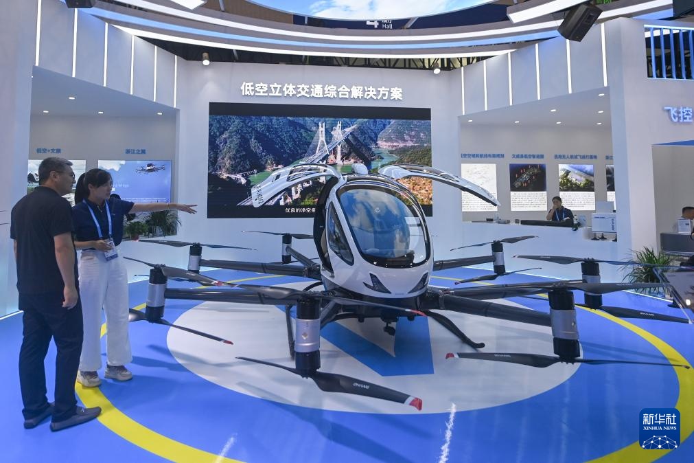 9月25日,观众在数智出行展区了解一款无人驾驶载人航空器。
