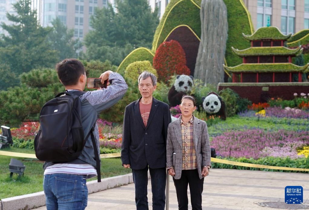 9月25日,人们在北京长安街东单路口附近以“大美中国”花坛为背景拍照。