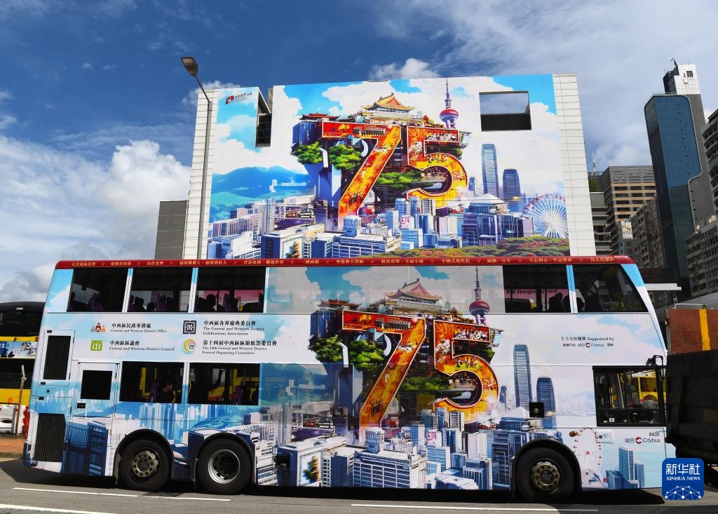9月25日,一辆涂装国庆75周年海报的公交车从香港中区警署外驶过。