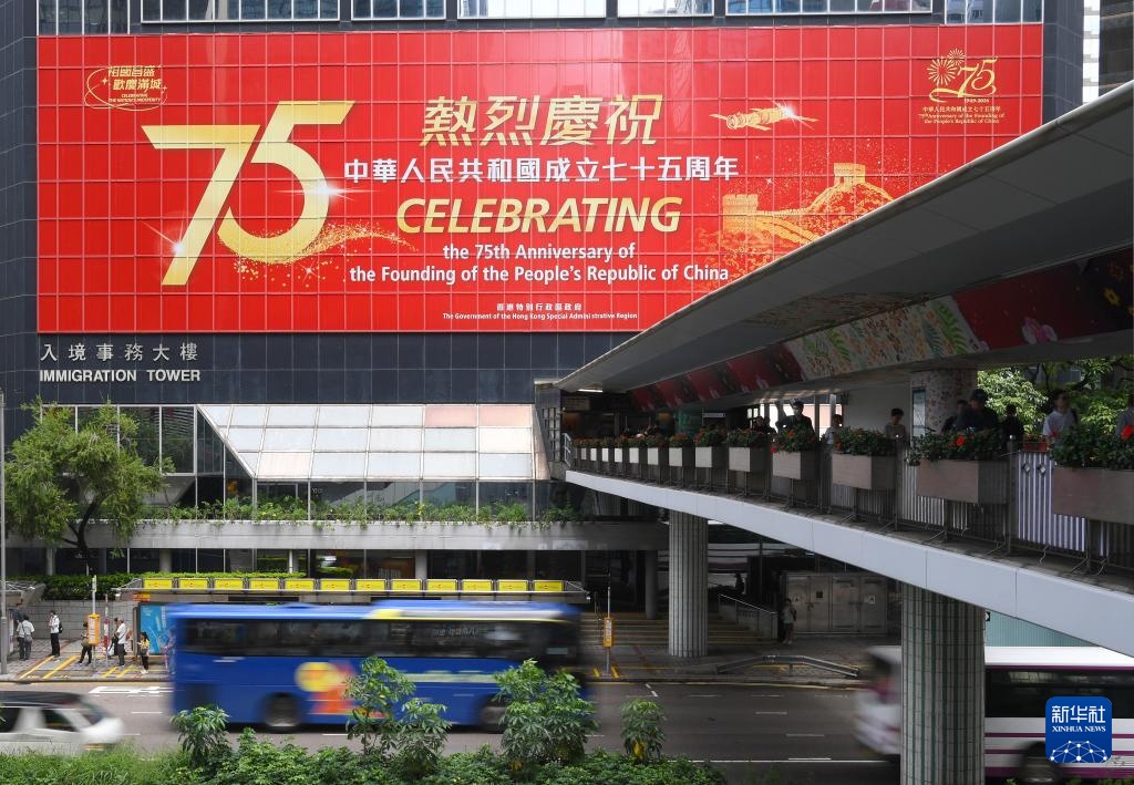 9月25日,香港入境事务大楼外墙上张贴着国庆海报。
