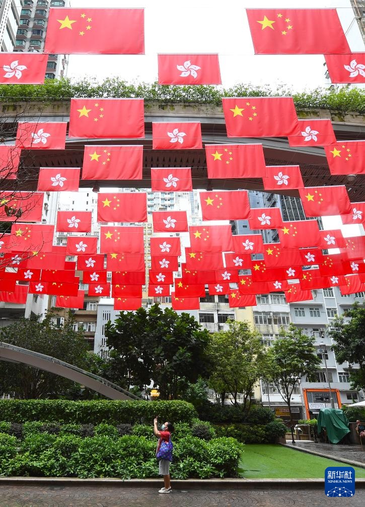 9月25日,香港利东街悬挂着五星红旗和紫荆花区旗。