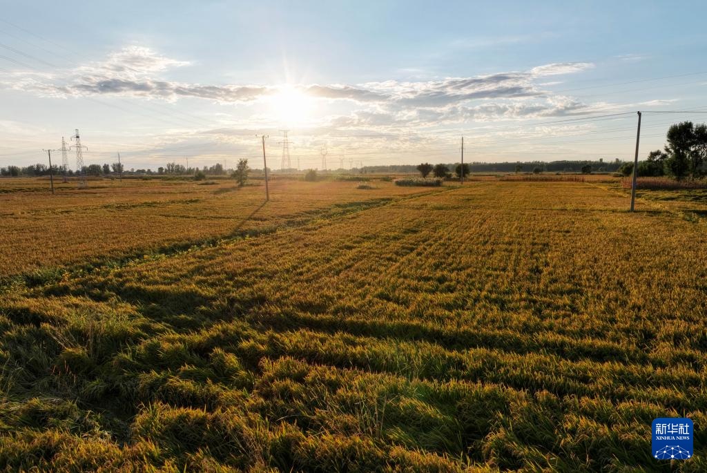 落日余晖映照辽宁盘锦的稻田(9月25日摄,无人机照片)。