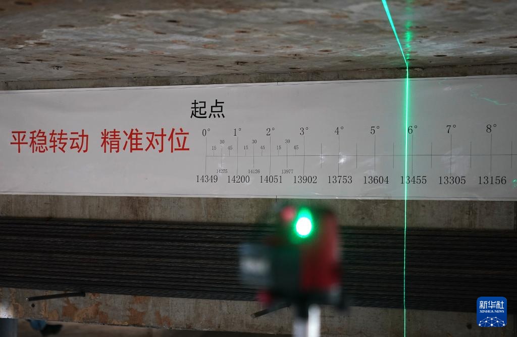 9月26日,技术人员在测量斜拉桥转体角度。