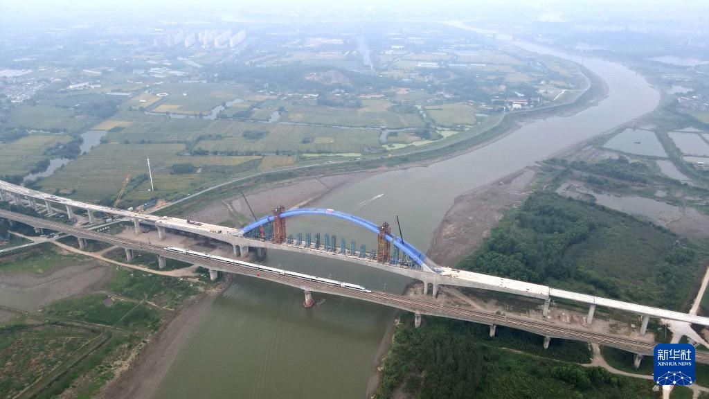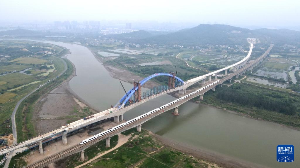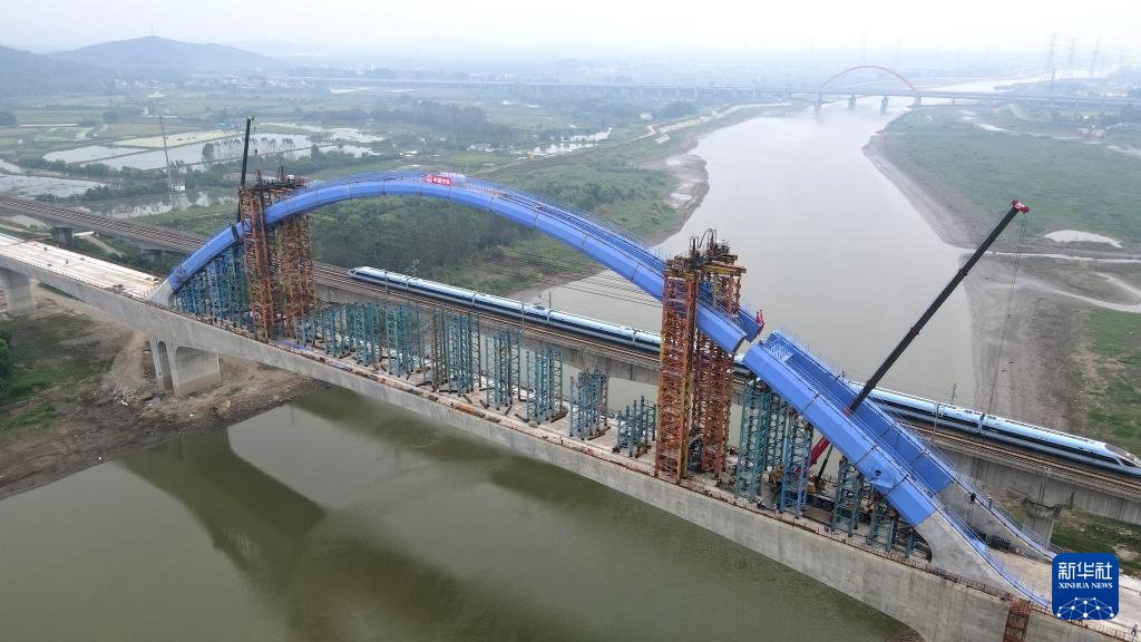 这是完成钢箱拱整体提升后的宁马城际铁路姑溪河特大桥(9月26日摄,无人机照片)。