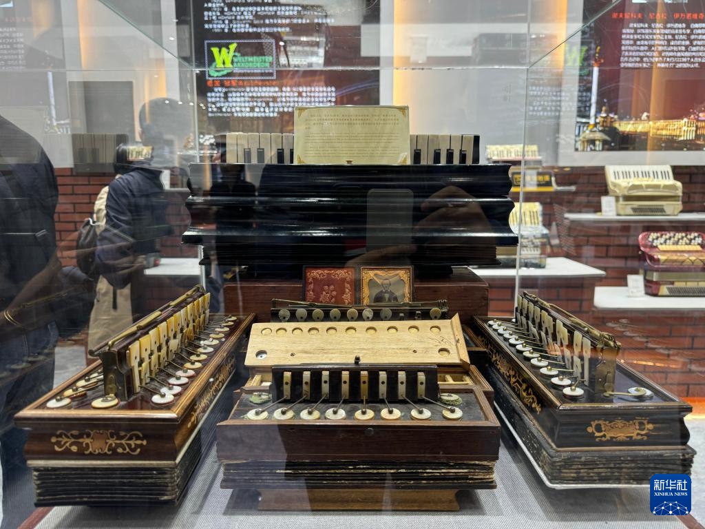 9月26日,当地群众在新疆塔城市手风琴文化展示厅内展示手风琴。