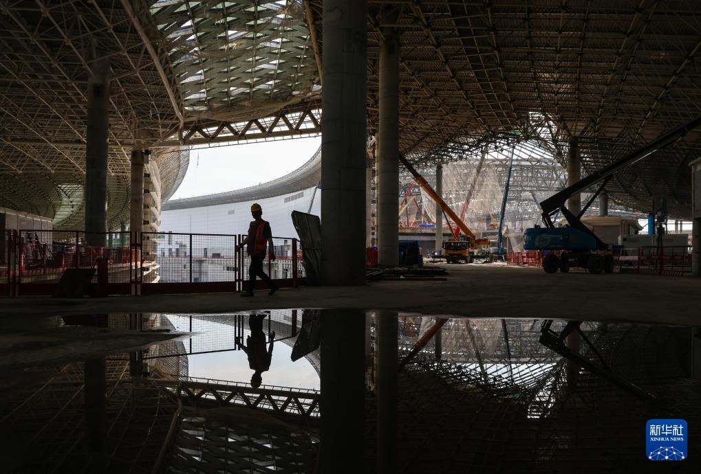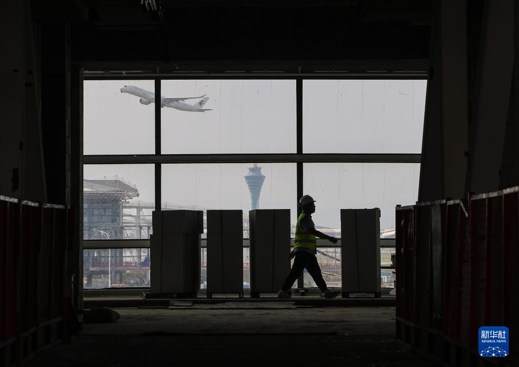 9月26日,一名施工人员从广州白云国际机场T3航站楼东指廊的幕墙前经过。