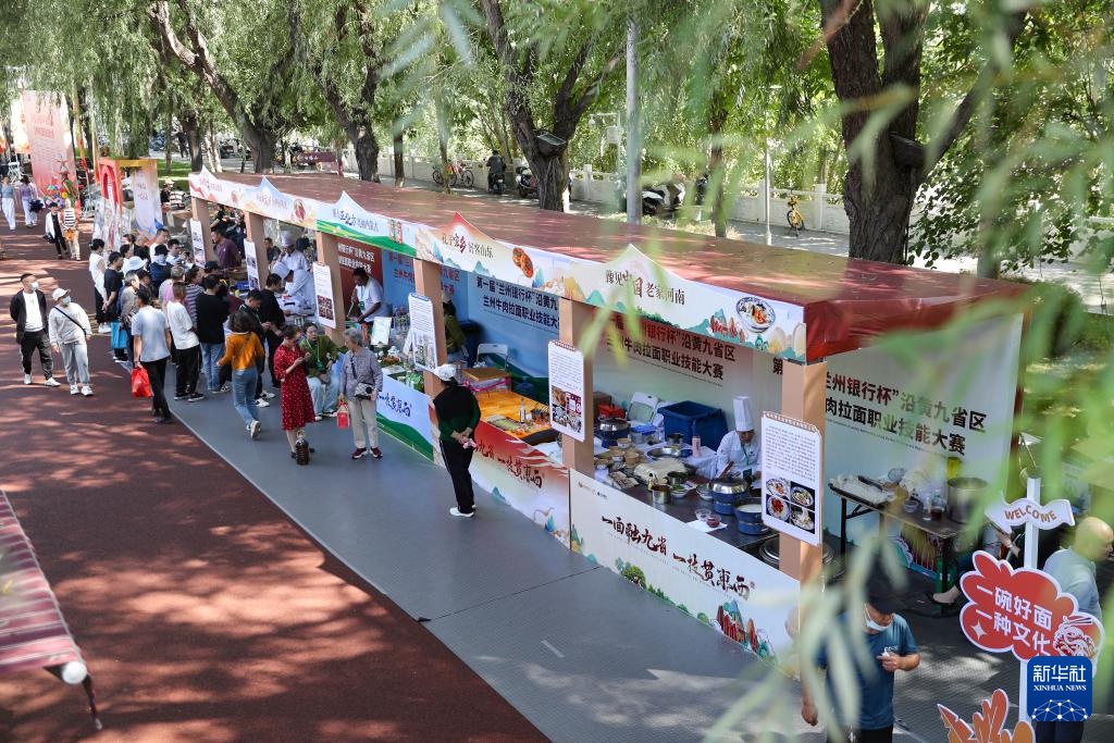 9月26日,来自陕西的拉面师傅为游客捞面。