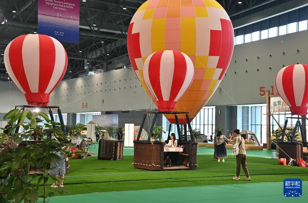 9月26日,观众在第21届中国—东盟博览会旅游展区体验热气球。