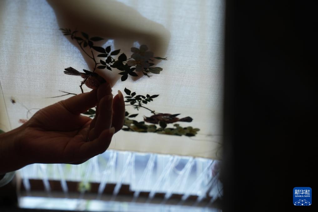 9月25日,在“观绣园”传习所内,卢建英(左)和女儿潘乃舒交流苏绣技艺。