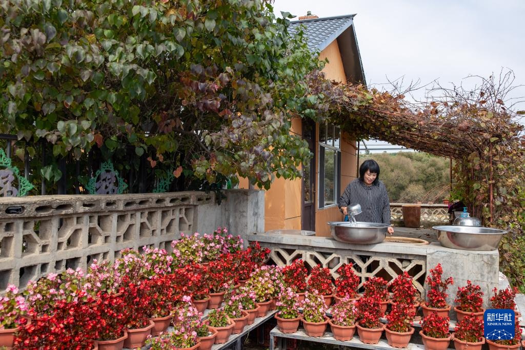 9月25日,在上官地村,村民薛艳新在接水浇花。