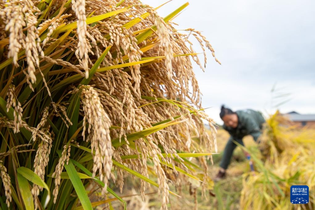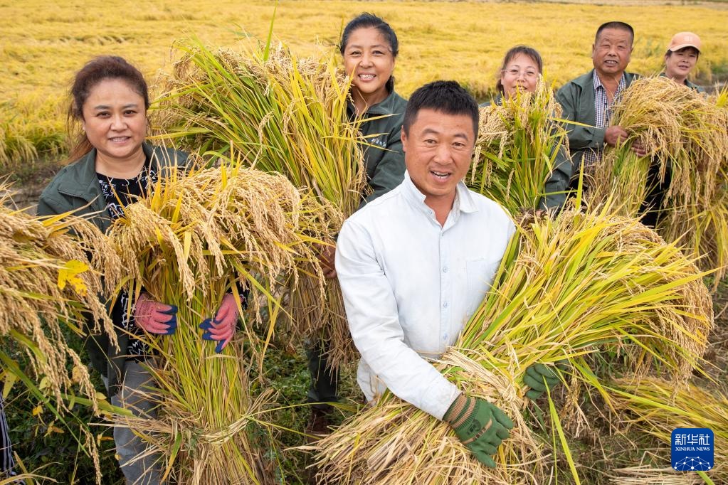 9月25日,在上官地村,村民抱着刚刚收获的水稻。