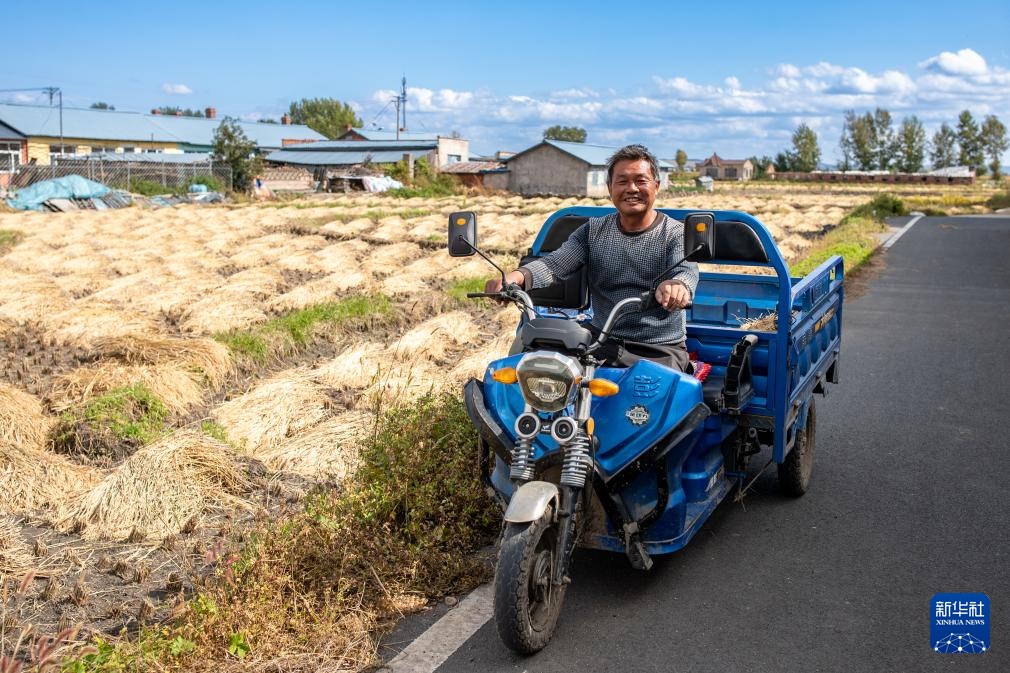 9月25日,在上官地村,村民骑车经过已经收割完的水稻田。