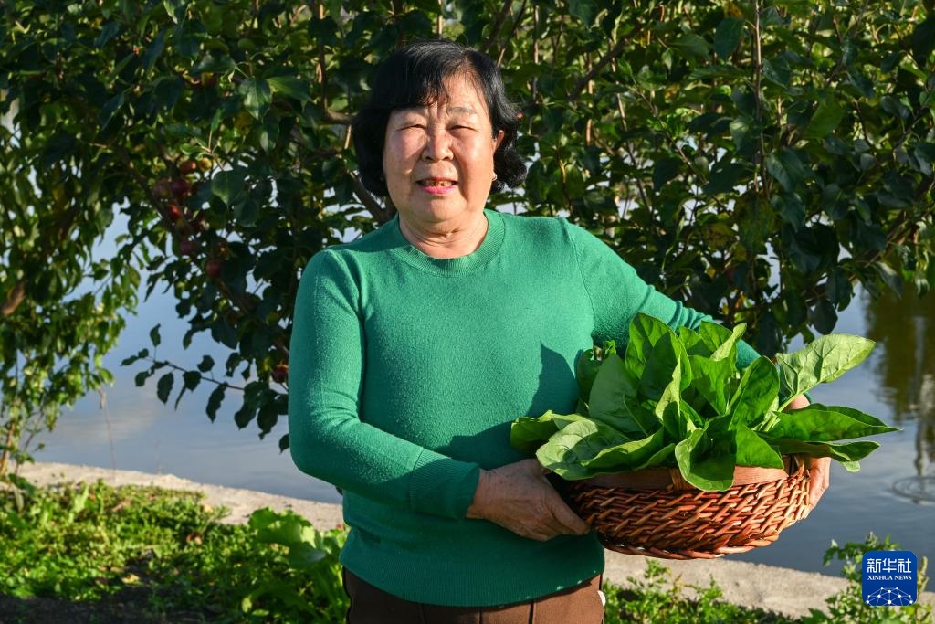 一名上官地村村民在家中的院子里摘菜(9月24日摄)。