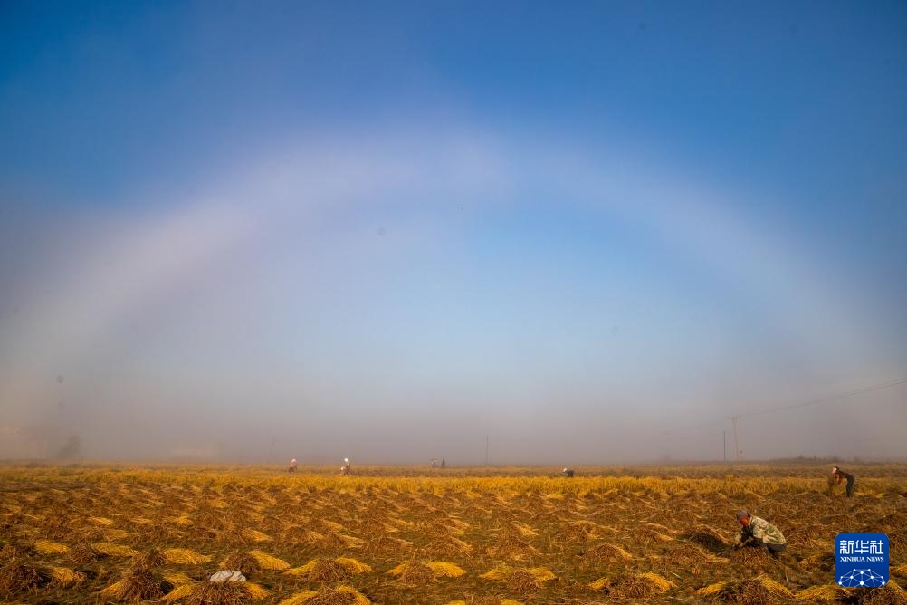 9月26日,在上官地村,村民在雾气中收割水稻。