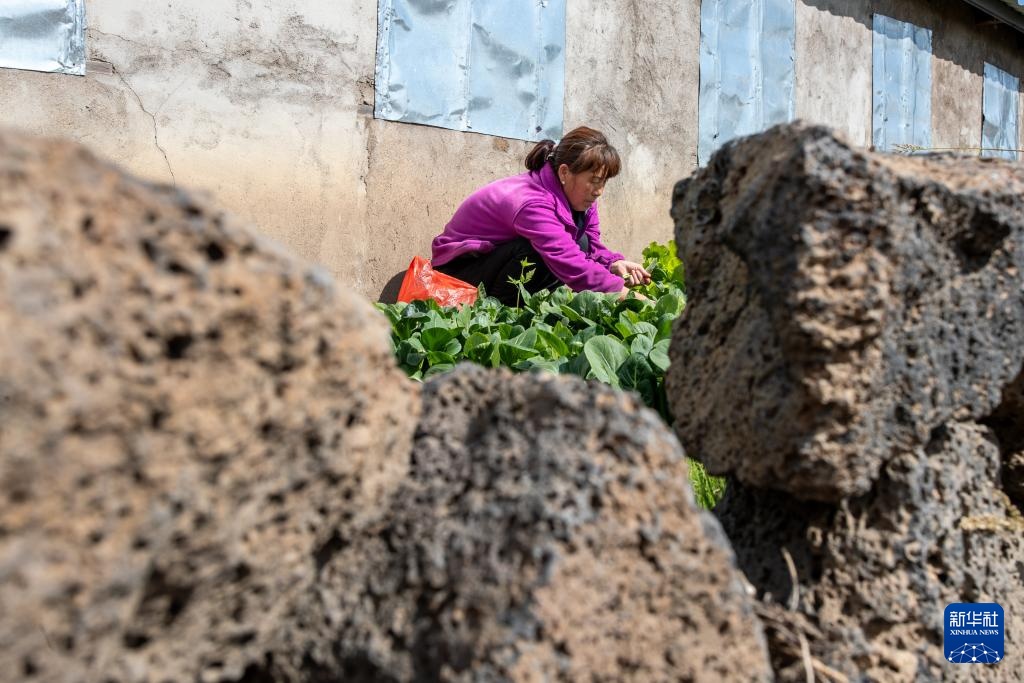 9月25日,在上官地村,村民张丽君在用火山岩石围起来的院子里摘菜。