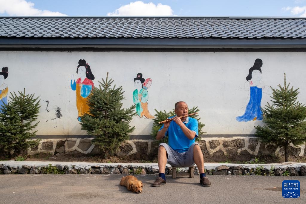 9月26日,在上官地村内,村民李范君在吹笛子。