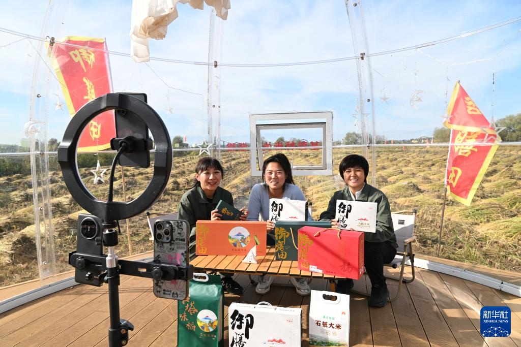 9月24日,在位于上官地村的稻米公园中,宁安市玄武湖大米专业合作社销售经理陈雨佳(右)与村民通过直播带货推广农产品。