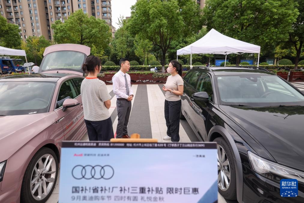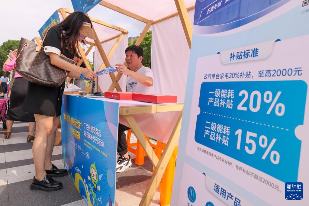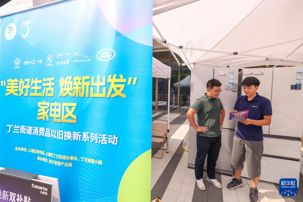 当日,浙江省杭州市上城区丁兰街道组织了一场名为“美好生活 焕新出发”的消费品以旧换新展会,拥有多个汽车、家电品牌展区,吸引了许多消费者前往咨询选购。在本次以旧换新展会上,消费者能够直接面对品牌、体验商品、购买时享受以旧换新政策补贴与品牌优惠。