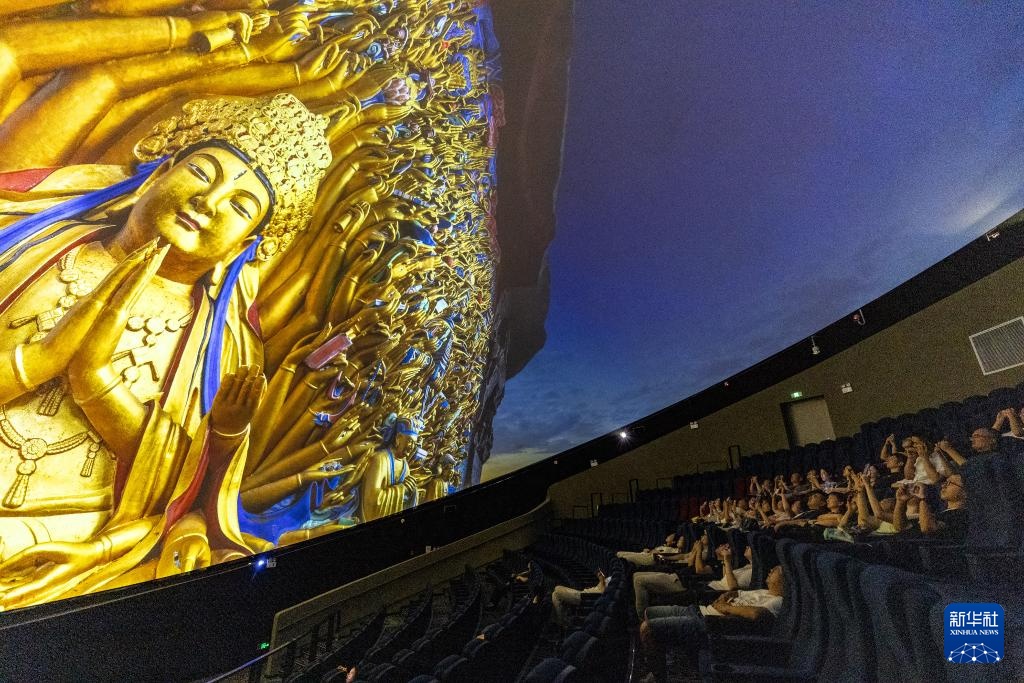 9月27日,游客在重庆大足石刻景区观看8K数字球幕影片《大足石刻》。