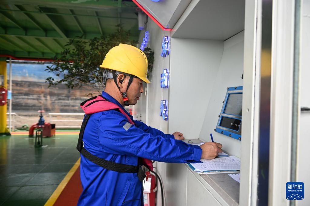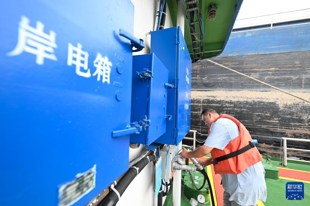 9月27日,船员在服务区使用岸电。