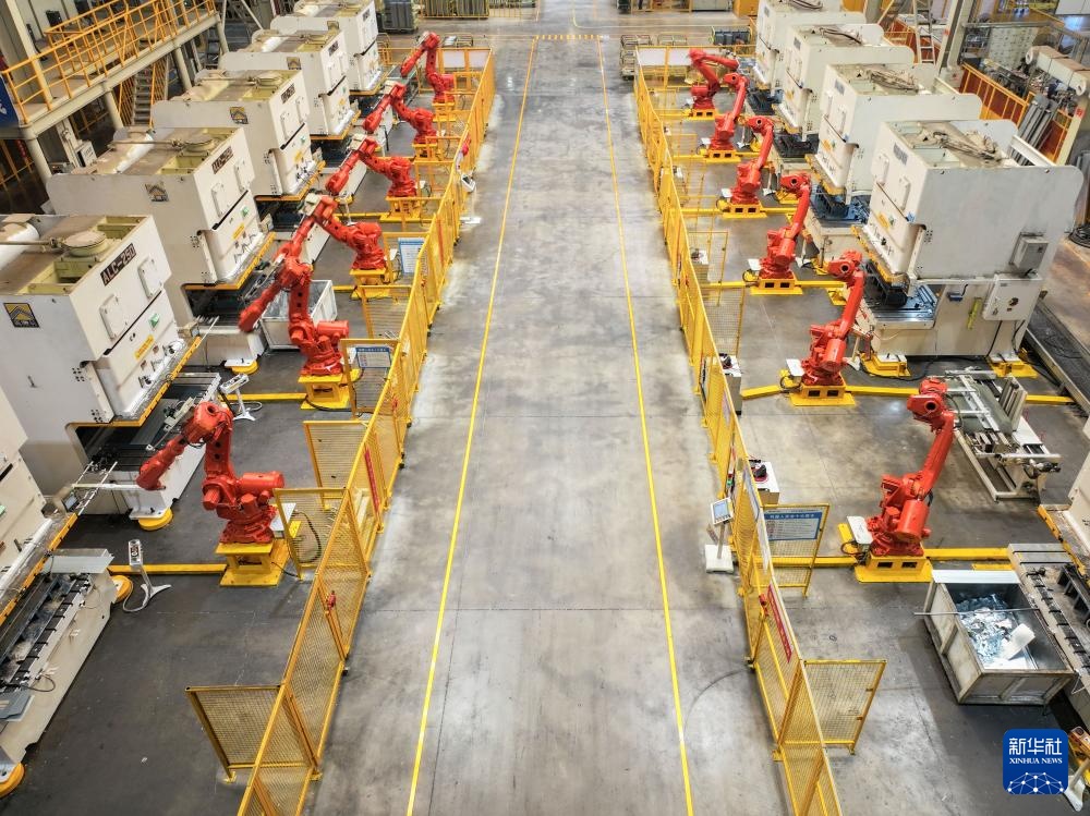9月27日,在宁乡市金洲新城的格力暖通制冷设备有限公司,机械臂在生产线上作业(无人机照片)。