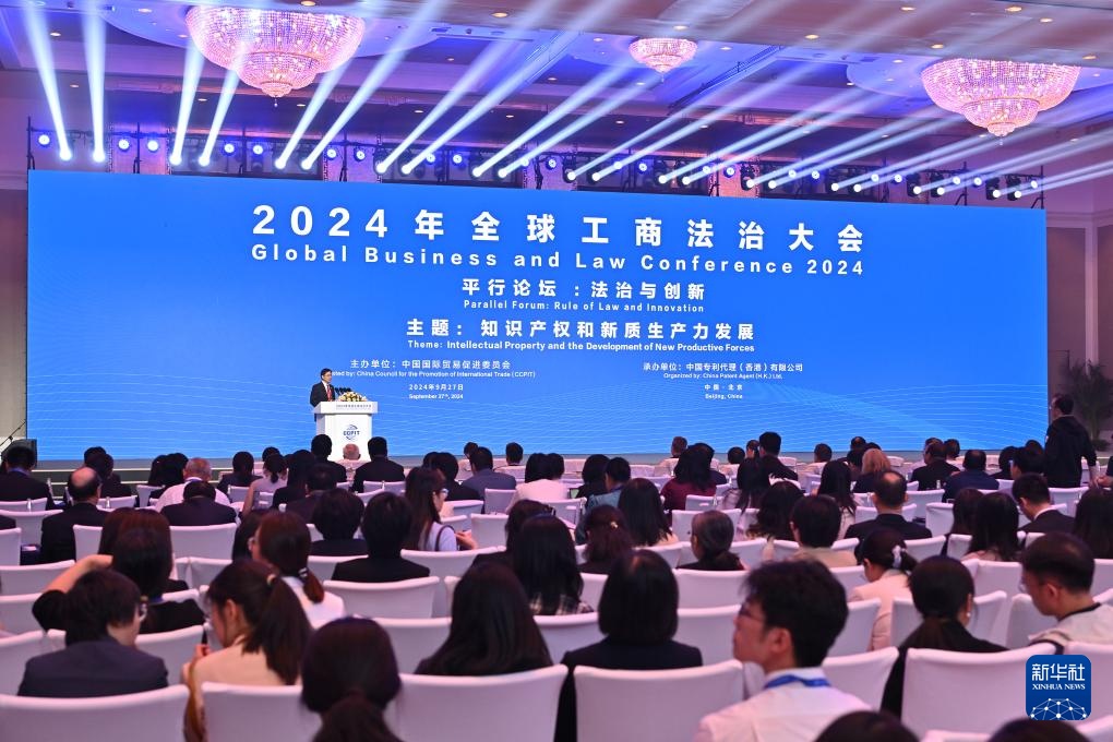 这是9月27日拍摄的2024年全球工商法治大会平行论坛:法制与创新,围绕“知识产权和新质生产力发展”的主题展开探讨。