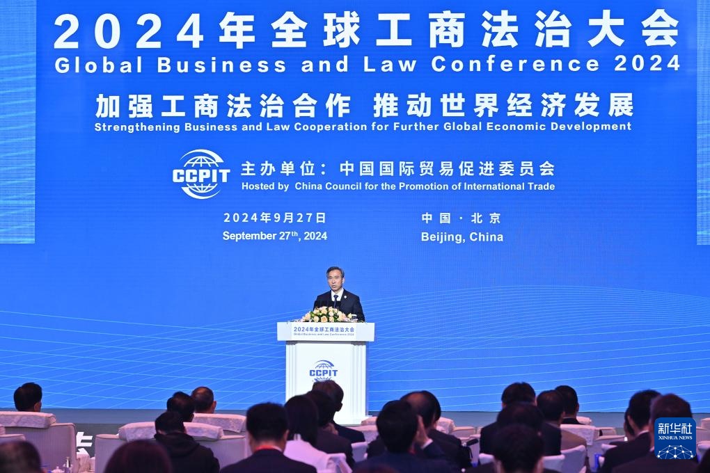 9月27日,中国贸促会会长任鸿斌在开幕式上发布《2024年全球工商法治大会北京宣言》。