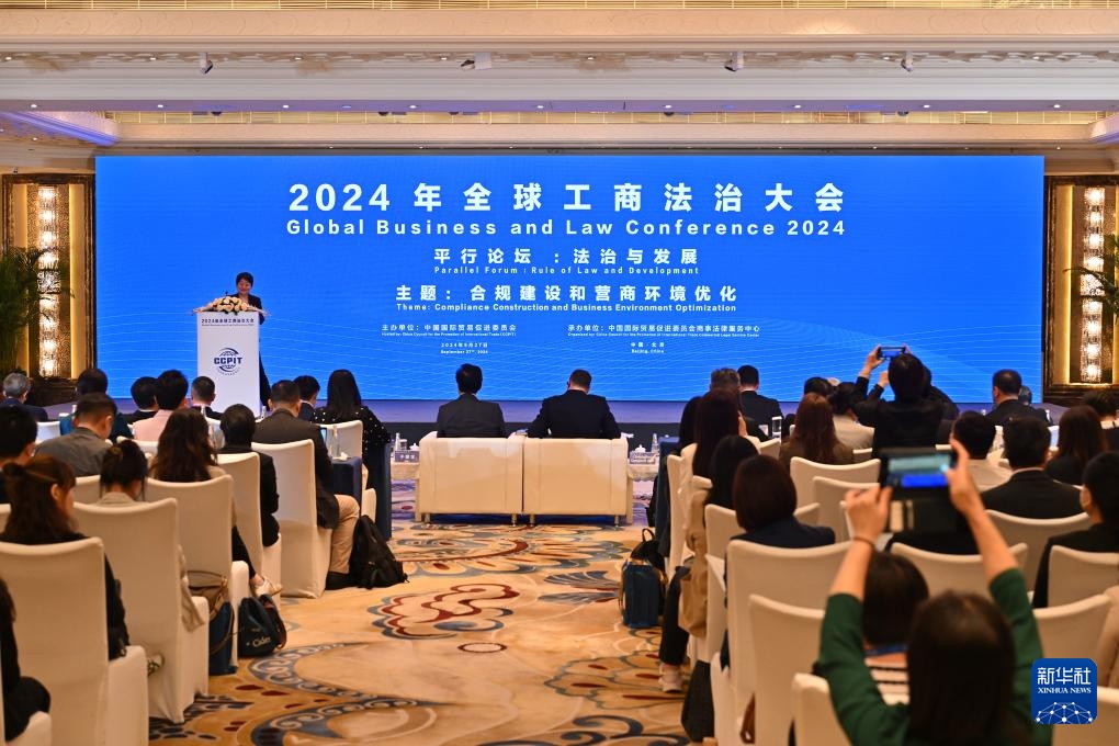这是9月27日拍摄的2024年全球工商法治大会平行论坛:法制与发展,围绕“合规建设和营商环境优化”的主题展开探讨。