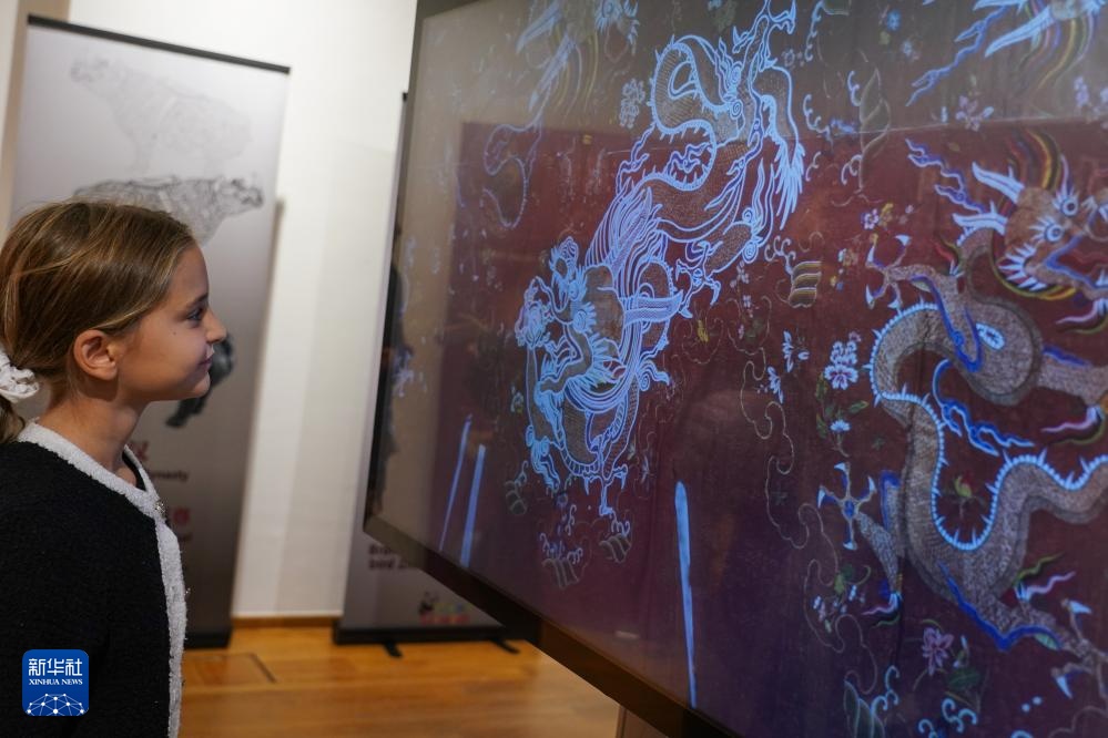 9月27日,在比利时布鲁塞尔中国文化中心,观众在“看见中国”之《纹样与色彩:中华工艺之美》数字文化展上参观。
