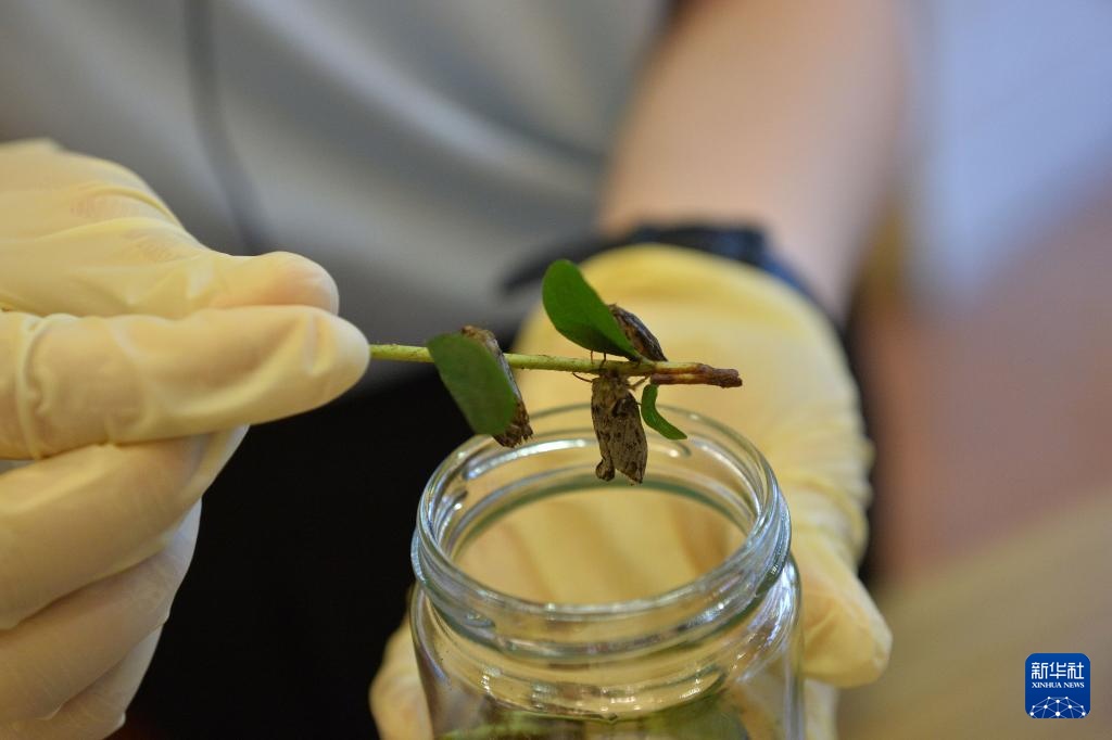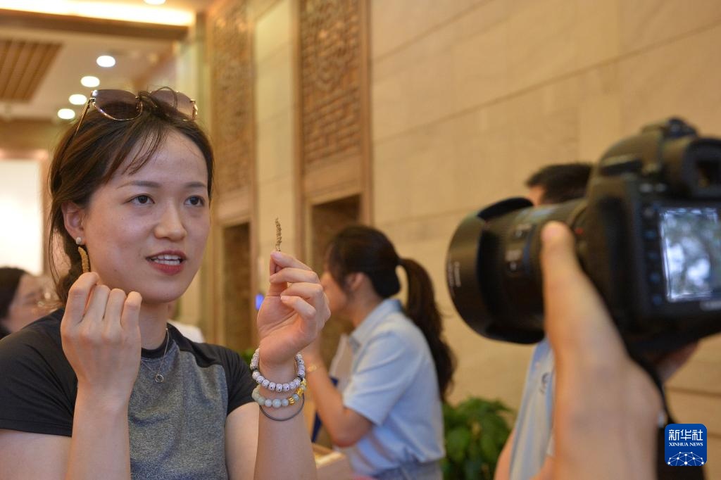 9月27日,工作人员在太极医药城A区的虫草产业展台展示蝙蝠蛾成虫,蝙蝠蛾幼虫是人工抚育冬虫夏草的原料之一。