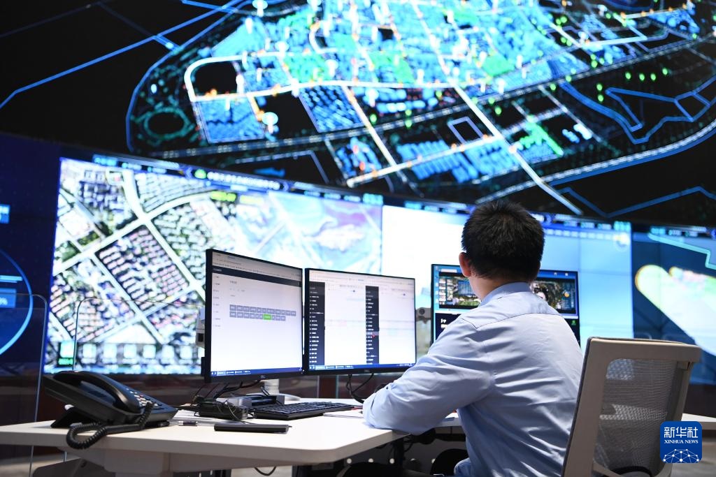9月27日,工作人员在中新天津生态城智慧城市运营中心内监控。