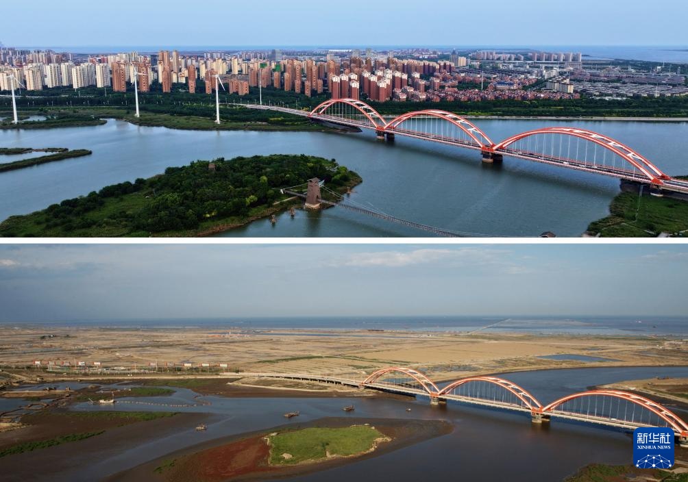 拼版照片:上图为2024年9月27日拍摄的中新天津生态城一景(无人机照片,新华社记者赵子硕摄);下图为2009年拍摄的中新天津生态城一景(资料照片,新华社发)。
